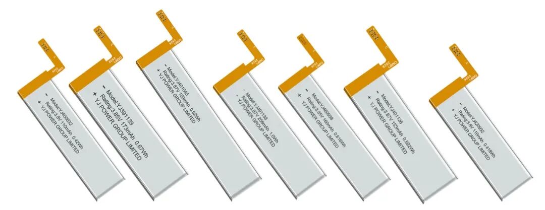 产品均采用方形铝塑膜封装,搭配软板带连接器,既保障了结构稳定性,又为空间布局提供了更多可能。在核心参数上,几款电芯重量仅在1.9g至4.6g之间,厚度最薄可达3.9mm,凭借精巧的结构设计,可灵活嵌入AI智能眼镜的镜腿、镜框等极度狭小的空间,不占用设备功能模块布局空间。